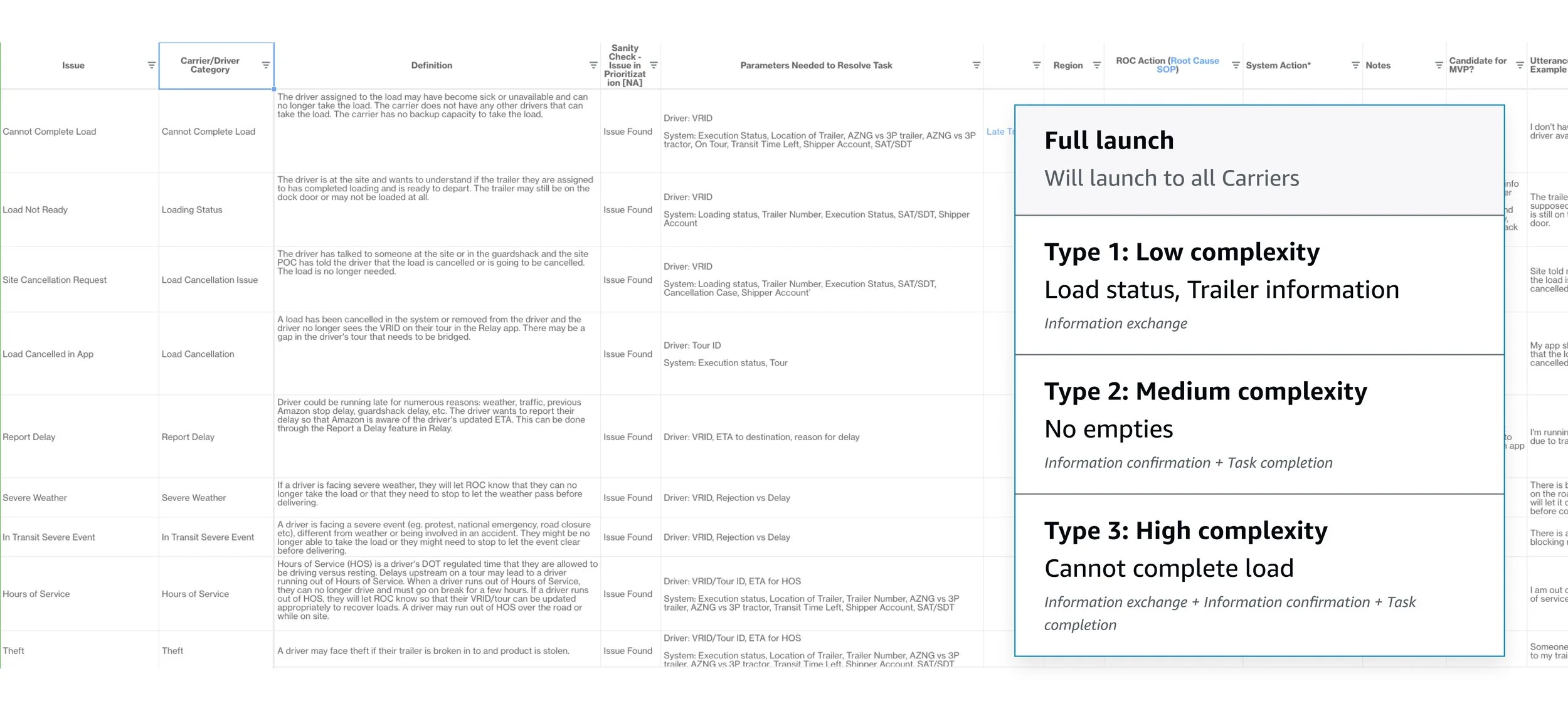 Usability testing showed promising results and carriers loved the ease of getting answers without needing to navigate through decision trees, forms and multiple dead ends. It was now time to go beyond answering questions; and move towards automating resolutions for carriers. While the tech team was thinking and exploring frameworks for agents to solve these different types of problems, I was exploring ways to classify problems based on their level of complexity. Higher the complexity, greater the risk of latency and a bad carrier experience. We defined complexity based on the number of actions that a carrier needed to take, the kind of information and data our back end needed to access to complete the action on behalf of the customer and the level of autonomy carriers would want with these actions. We ended up with 3 types of complexities after reviewing hundreds of carrier conversation transcripts.