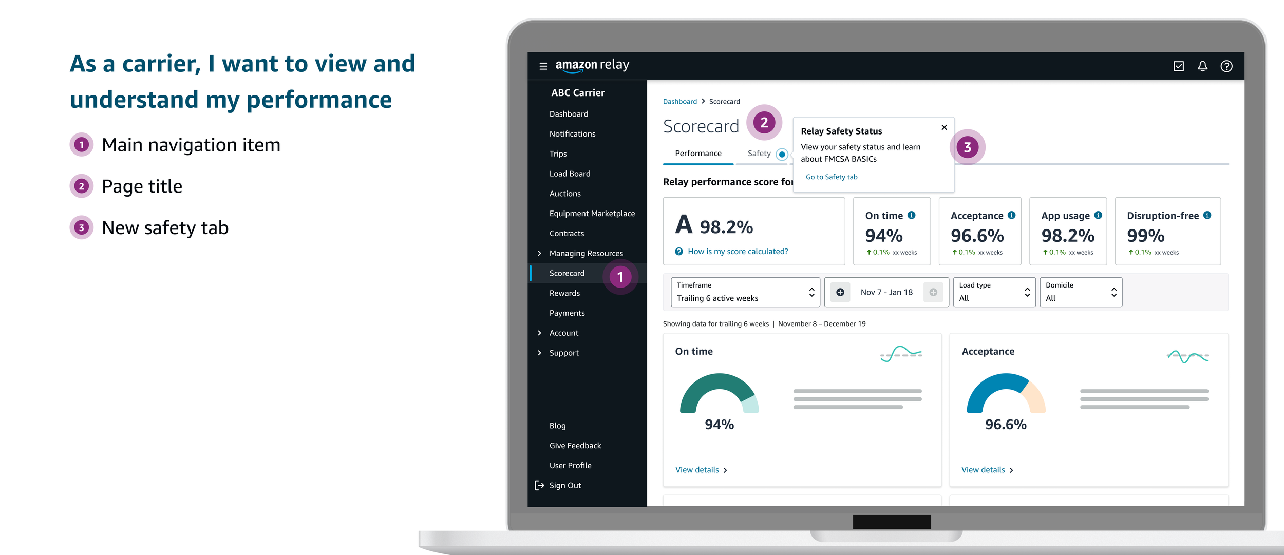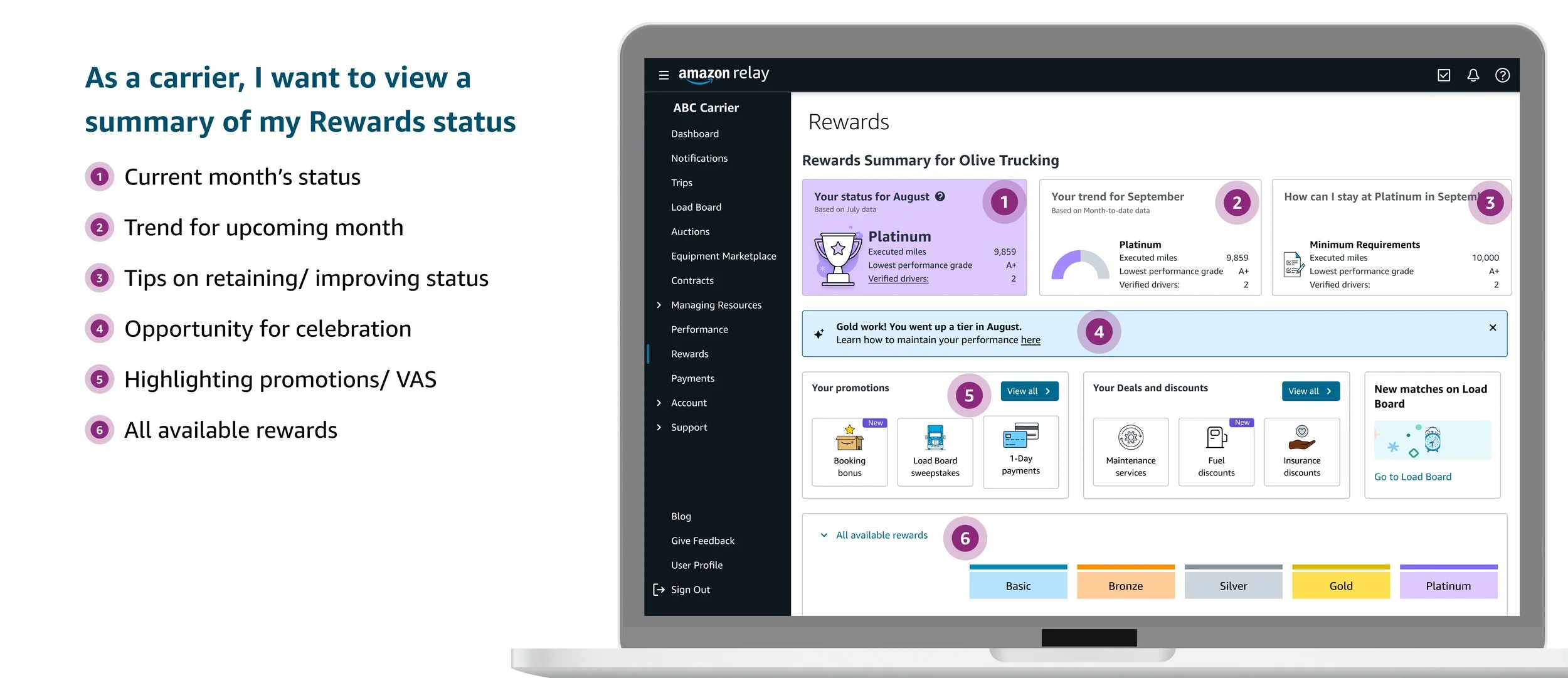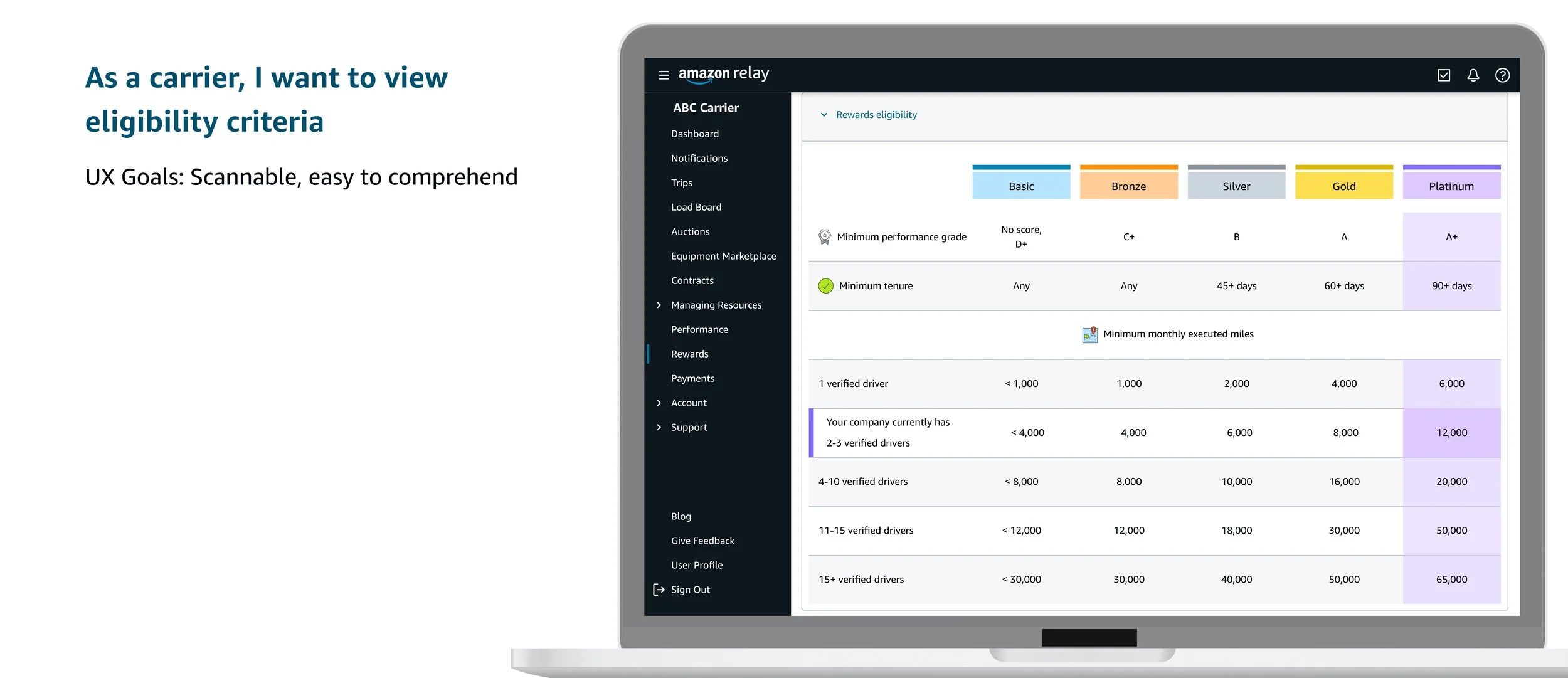 One of the long standing goals of Relay for carrier has been to work with high performing and safe carriers on a continuous basis. In order to increase safety and provide incentives to carriers that bring delight, I was tapped to create and enhance 2 experiences for carriers: Safety and Rewards.